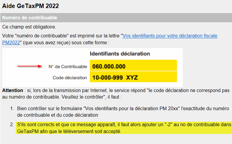 Si vous avez bien contrôlé sur le formulaire "Vos identifiants pour la déclaration PM 20xx" et que ce message arrive, il suffit de rajouter un "-2" au no de contribuable dans GeTaxPM afin que le téléversement soit accepté. Ceci est d'ailleurs indiqué dans l'aide du champ "No de contribuable":